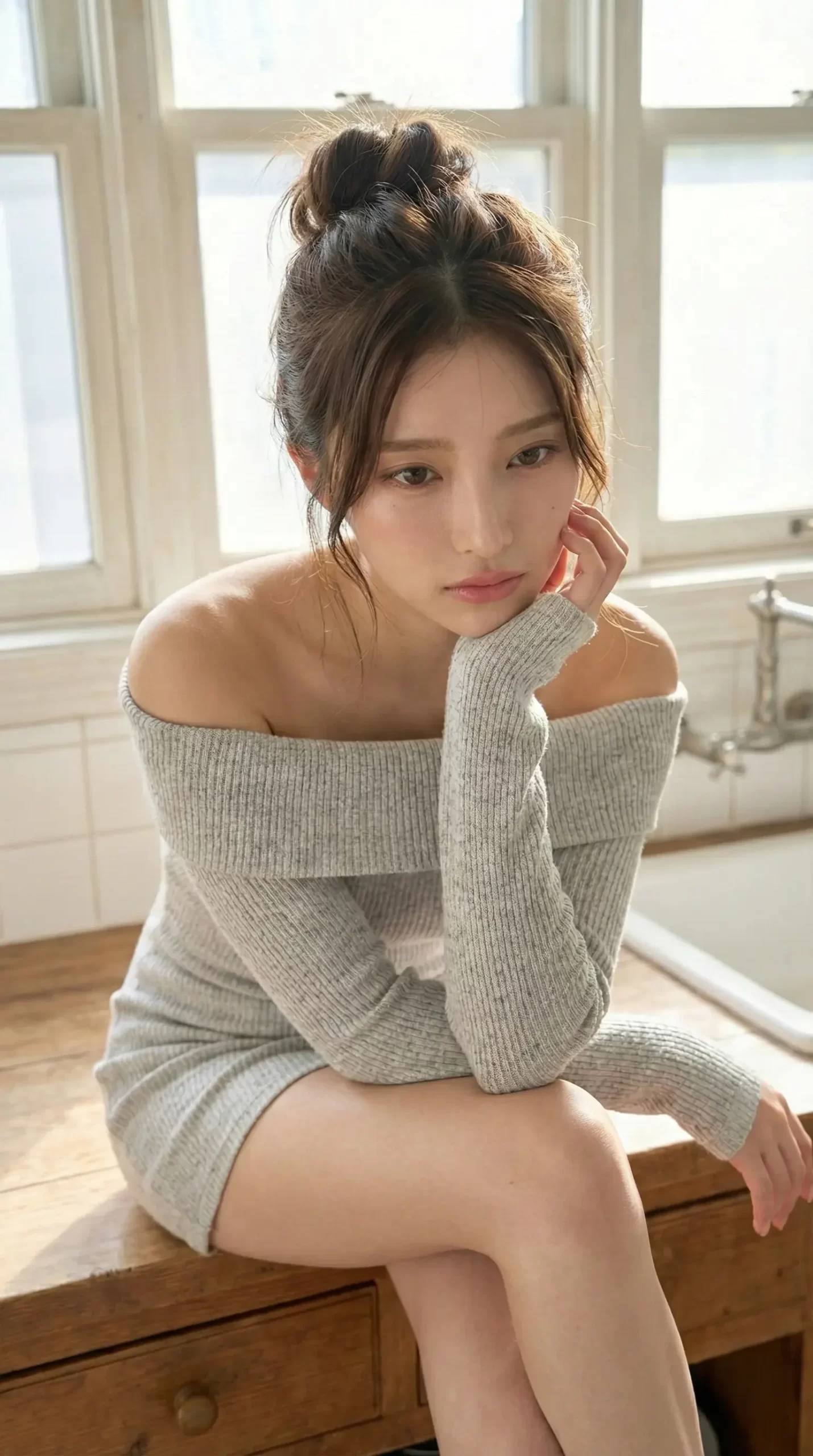 見てください、この透き通るような肌と、無防備なデコルテライン!✨ ざっくりしたグレーのリブニットから覗く華奢な肩のラインが、たまらなくグッときますよね…。
