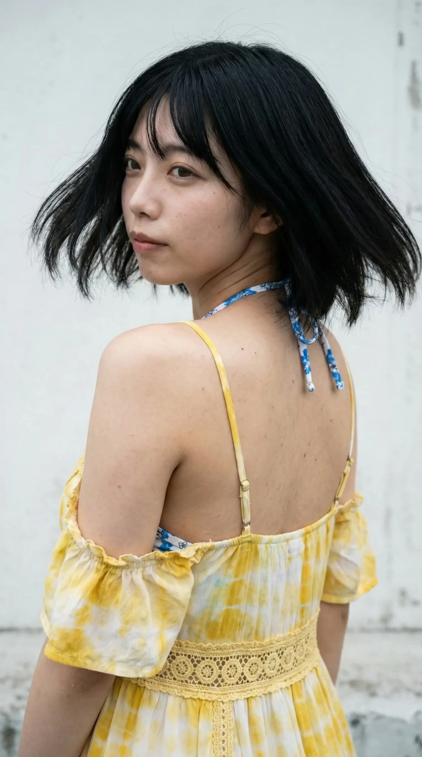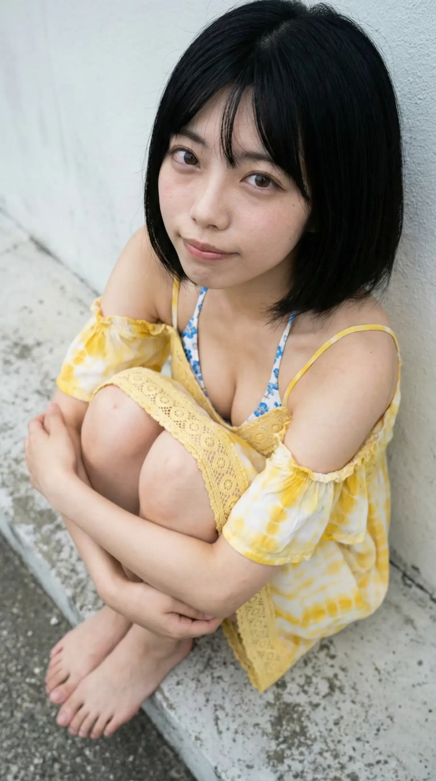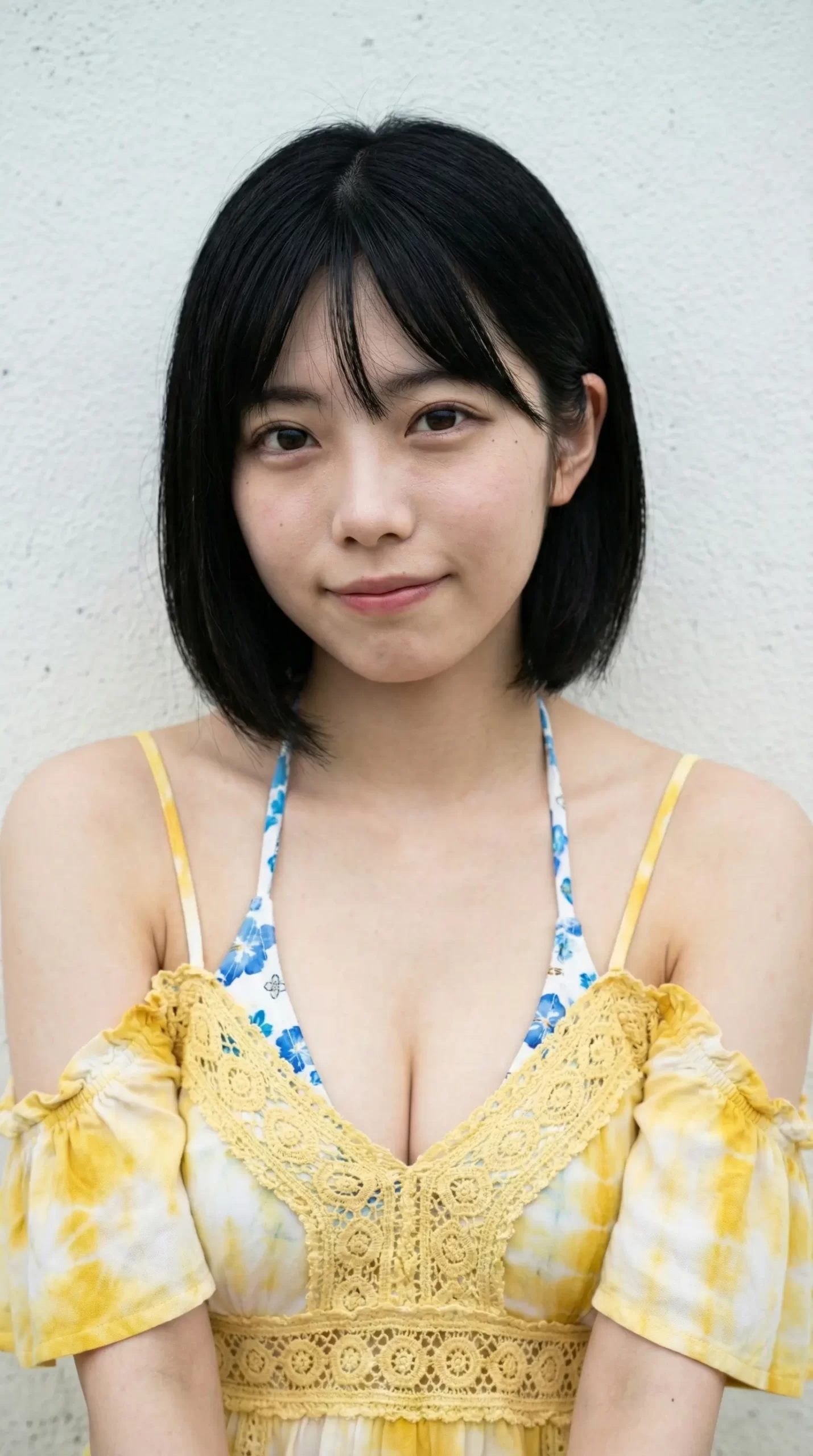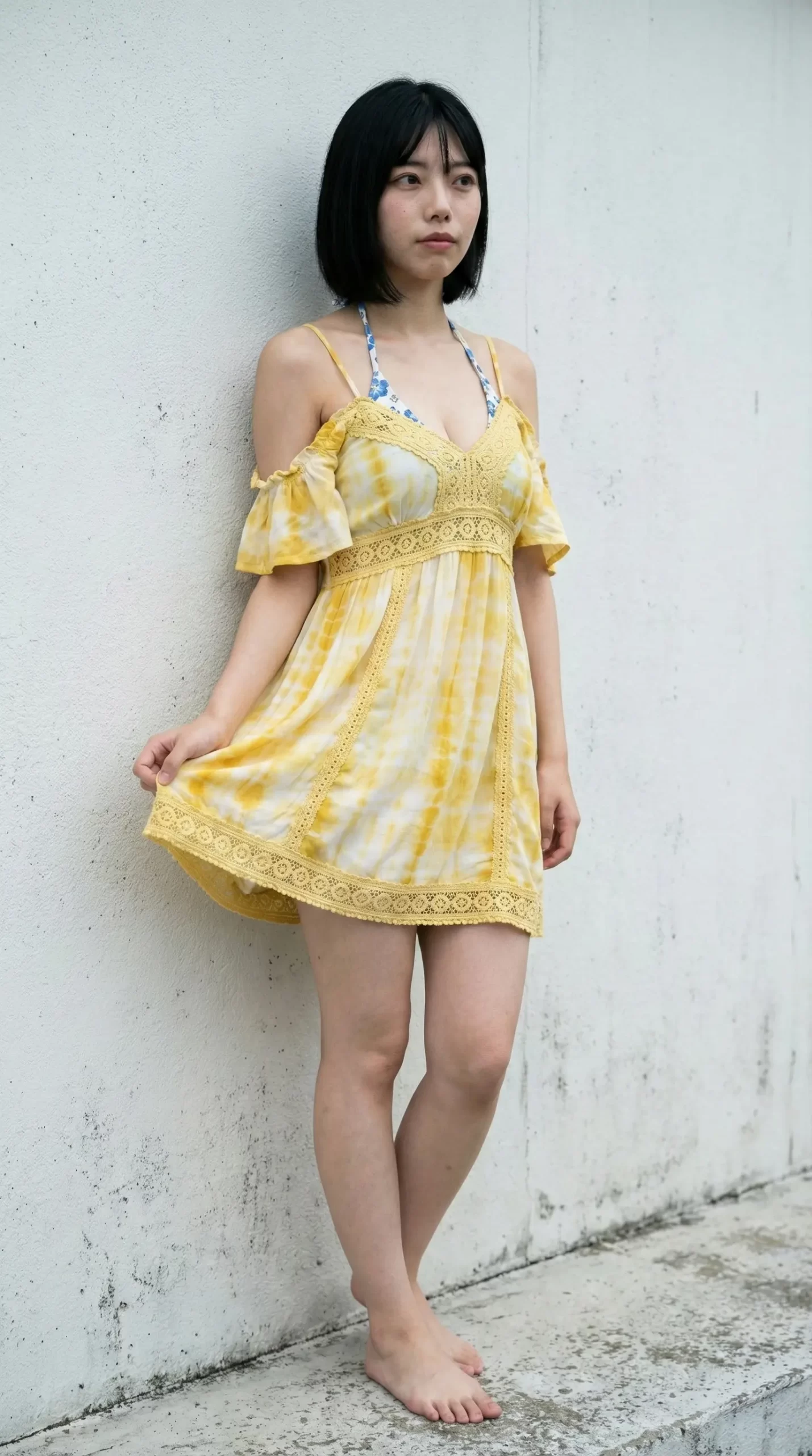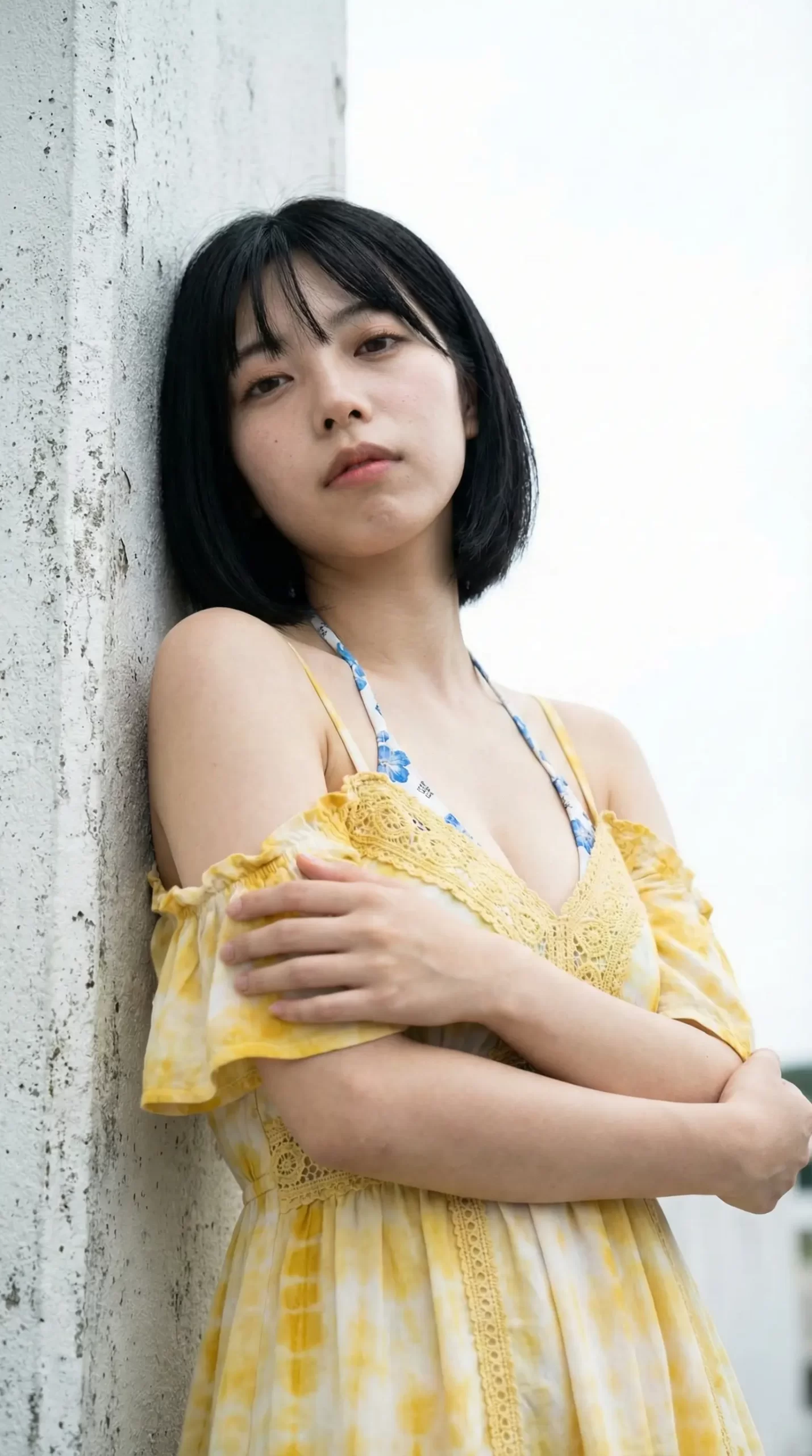 まず目が行くのは、この鮮やかな黄色のワンピース! 白い肌とのコントラストが最強すぎて、眩しいくらい輝いてるよね。 オフショルダーから覗く華奢な肩のラインや鎖骨の美しさが、健康的なのにどこか色っぽくて…男なら絶対グッとくるはず🔥
