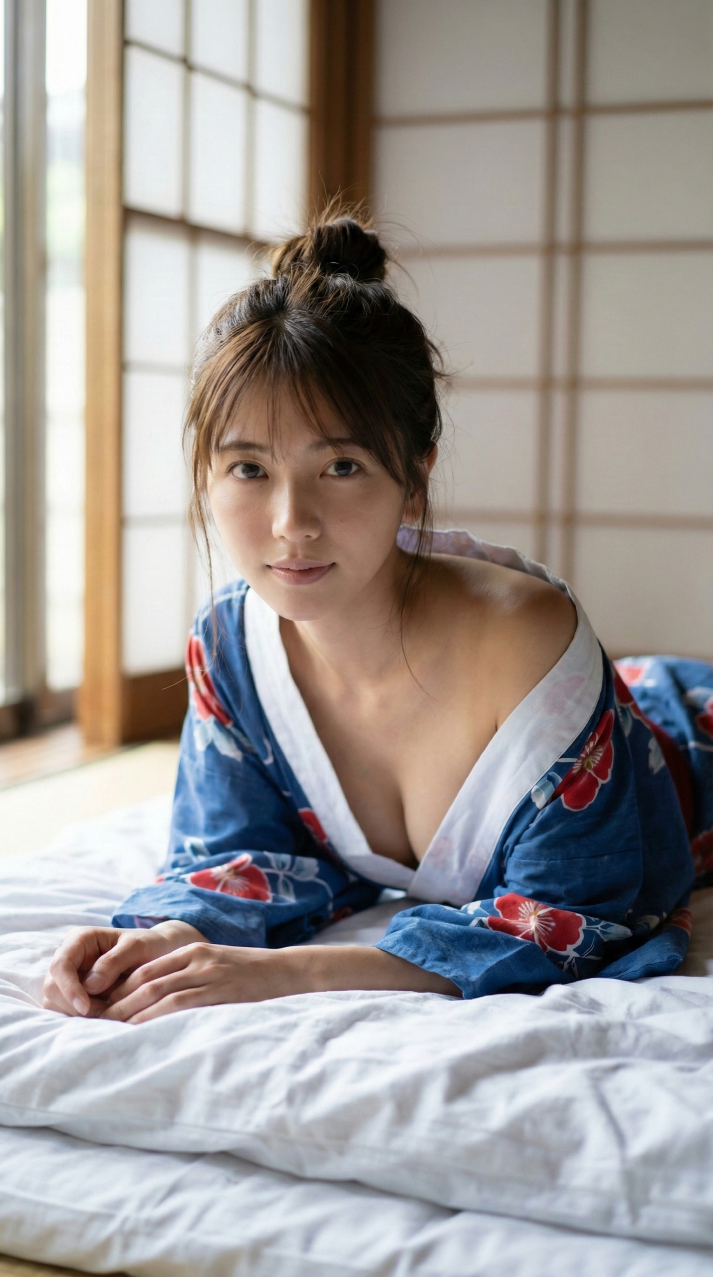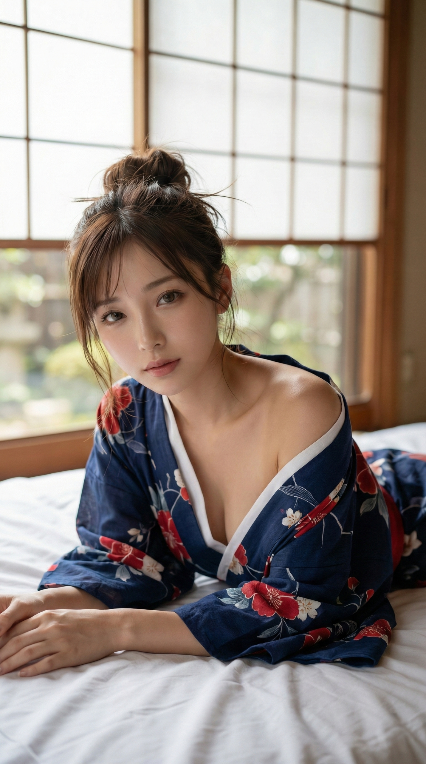 舞台は静かな和室。窓から差し込む柔らかな光と、清潔感のある白いお布団。 そこに、紺色に赤い花柄が映える浴衣をまとった美女がひとり…。