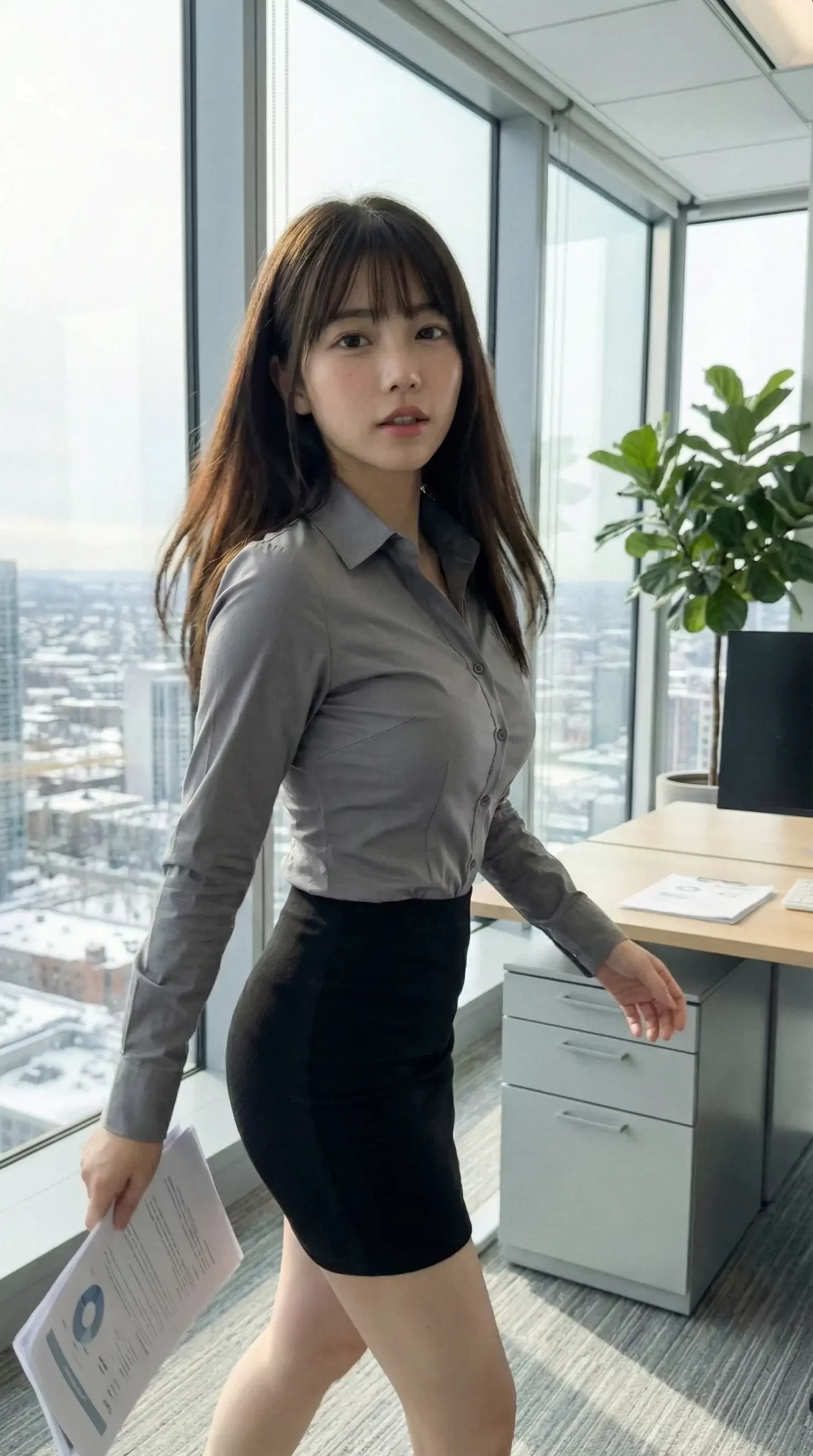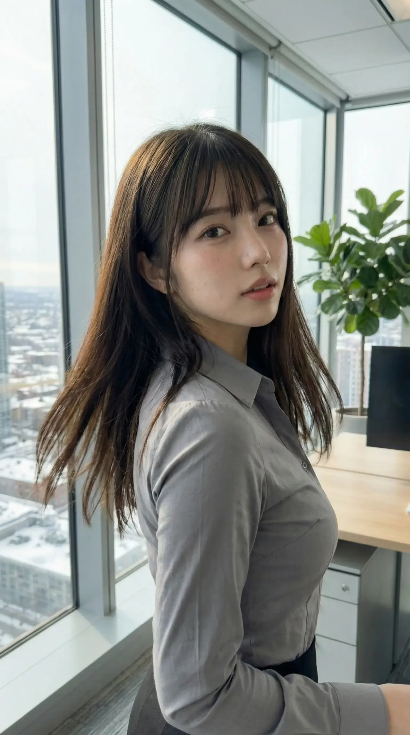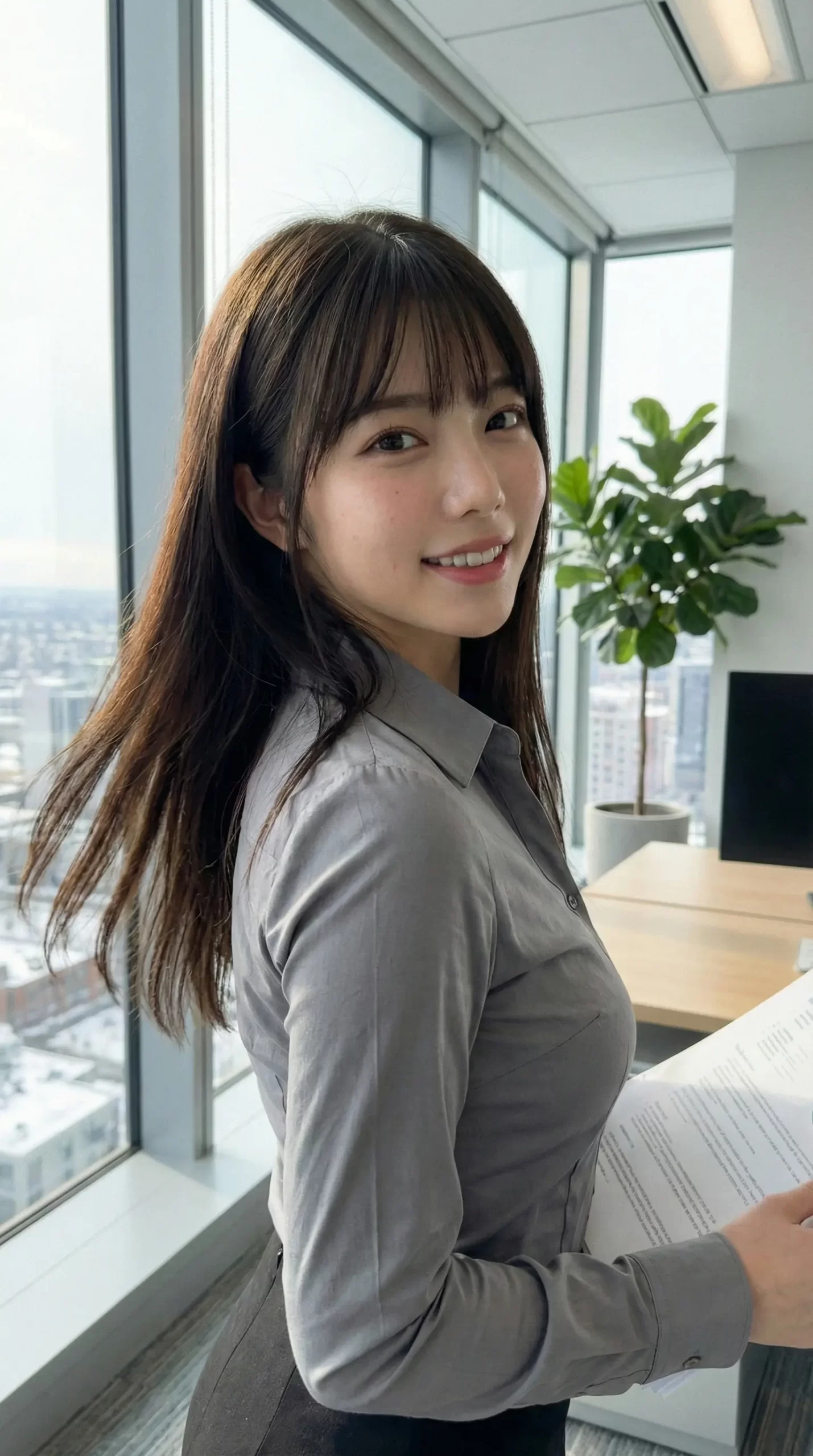 窓際で書類を持ちながら、ふとこちらを振り返る瞬間。 デスクに座って、少しリラックスした表情でこっちを見つめる視線。