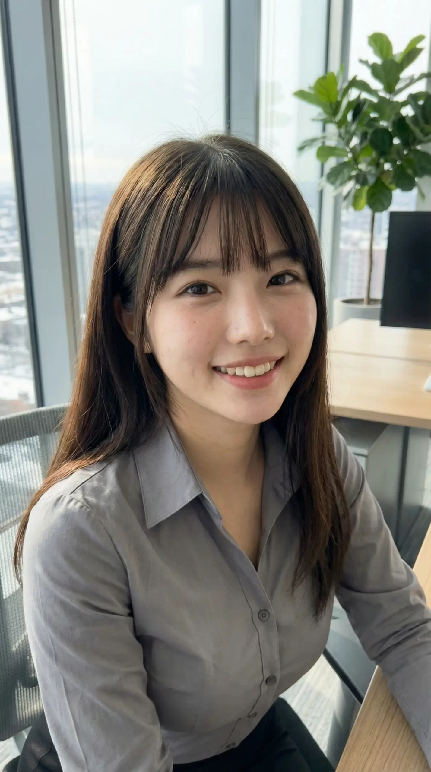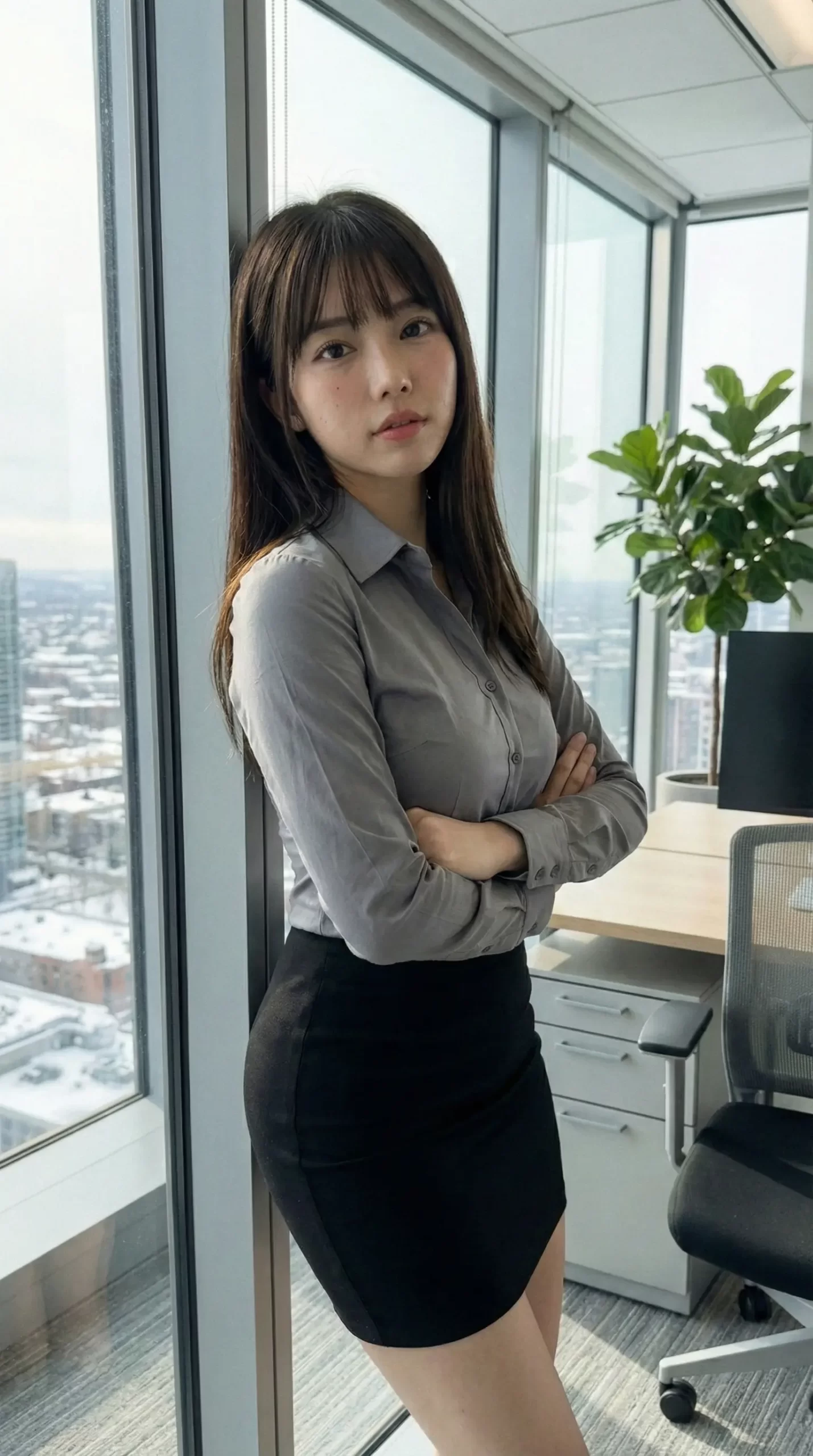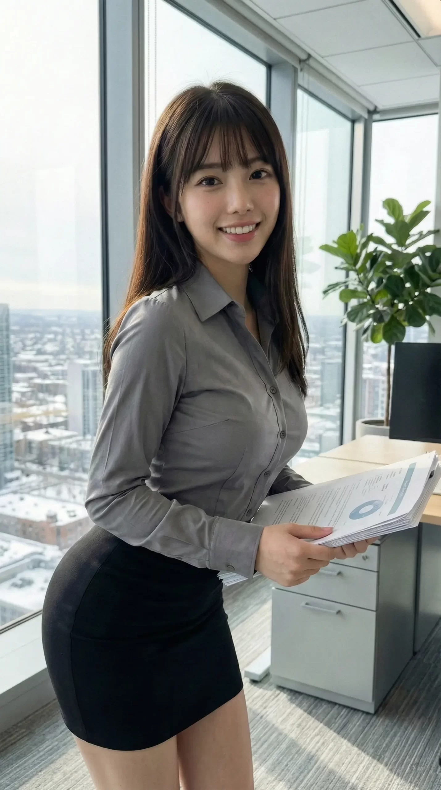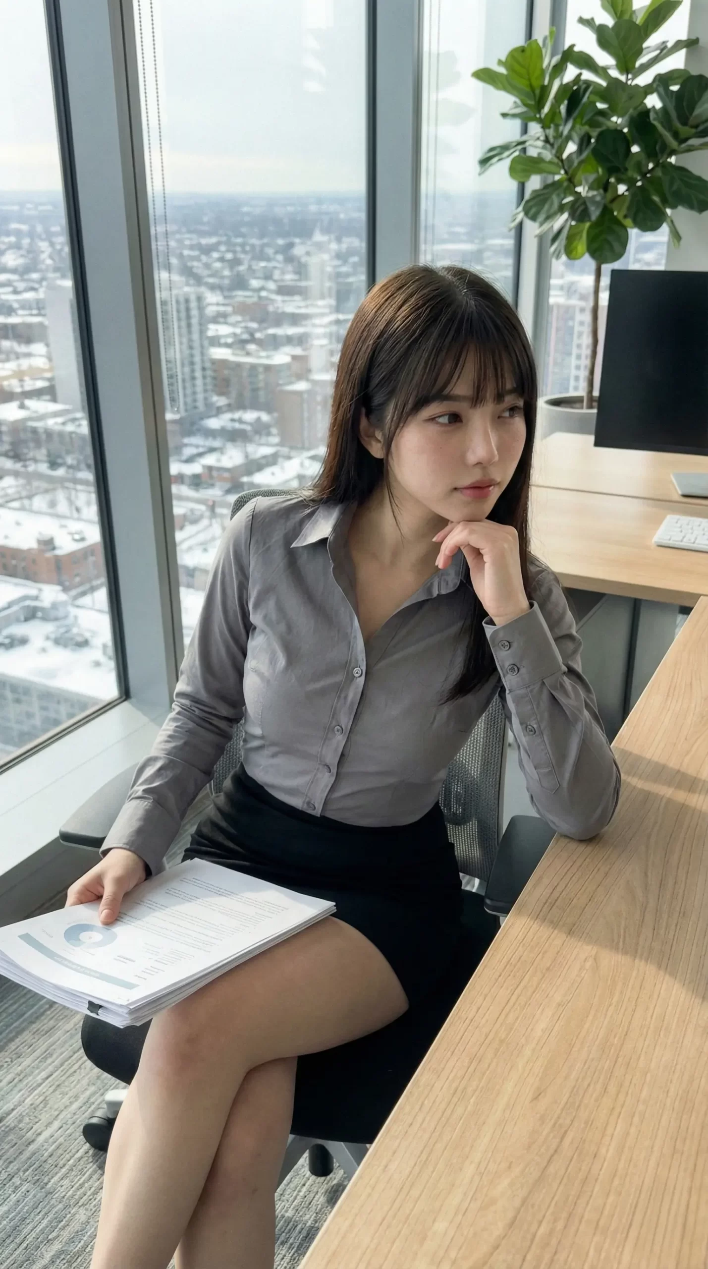 窓際で書類を持ちながら、ふとこちらを振り返る瞬間。 デスクに座って、少しリラックスした表情でこっちを見つめる視線。