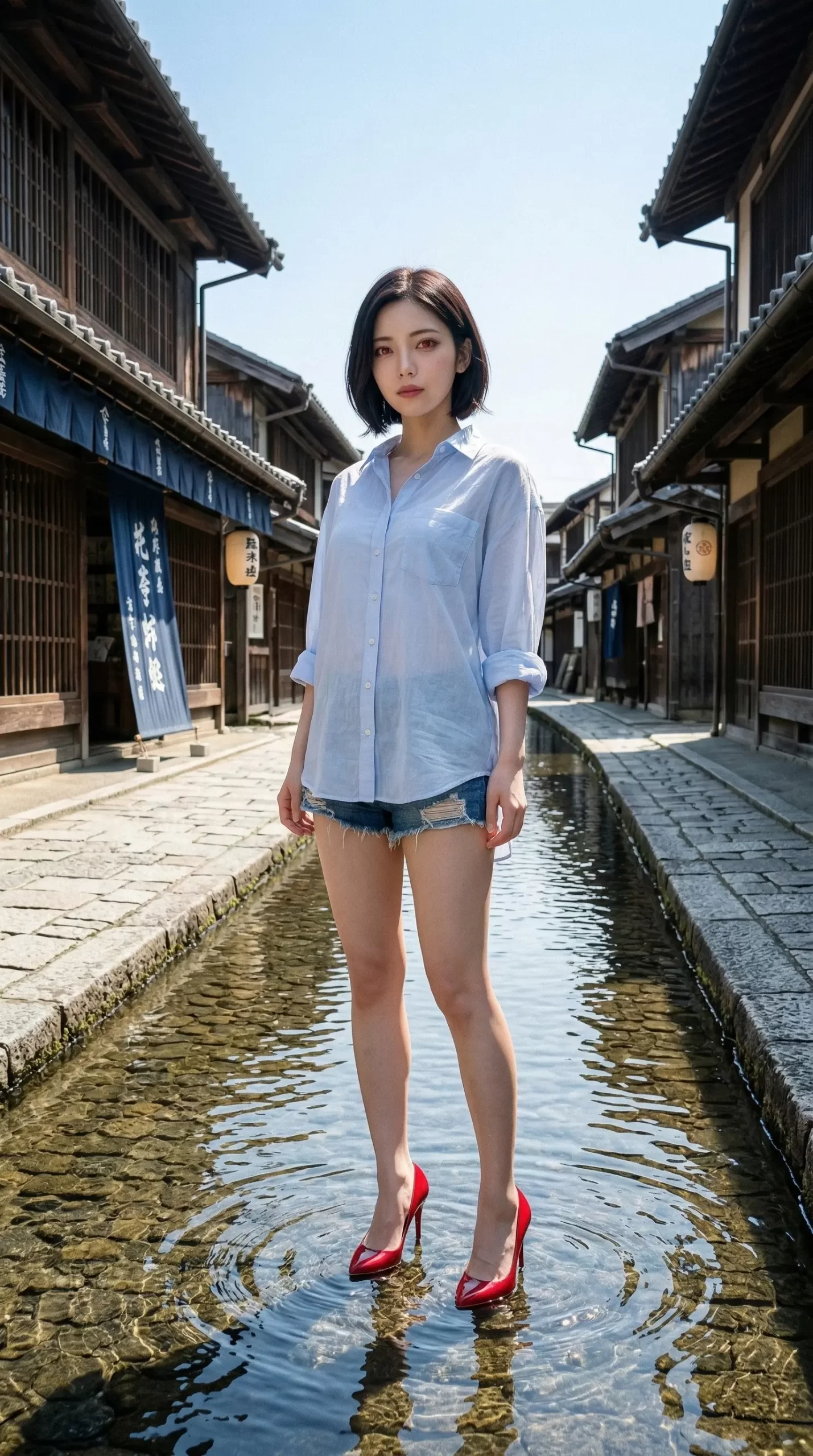 風情のあるレトロな水路に、あえてラフな水色のオーバーサイズシャツとデニムのショーパン。このアンバランスな組み合わせが たまらない よね。 😍