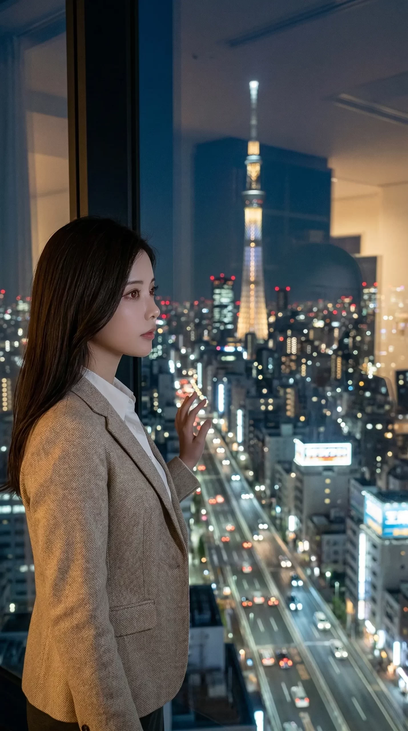 ベージュのスーツに身を包んだ、いかにも「できる大人の女性」という雰囲気。窓の外には美しく光るタワーと夜の街並みが広がっていて、この 圧倒的なエモさ がたまりません。