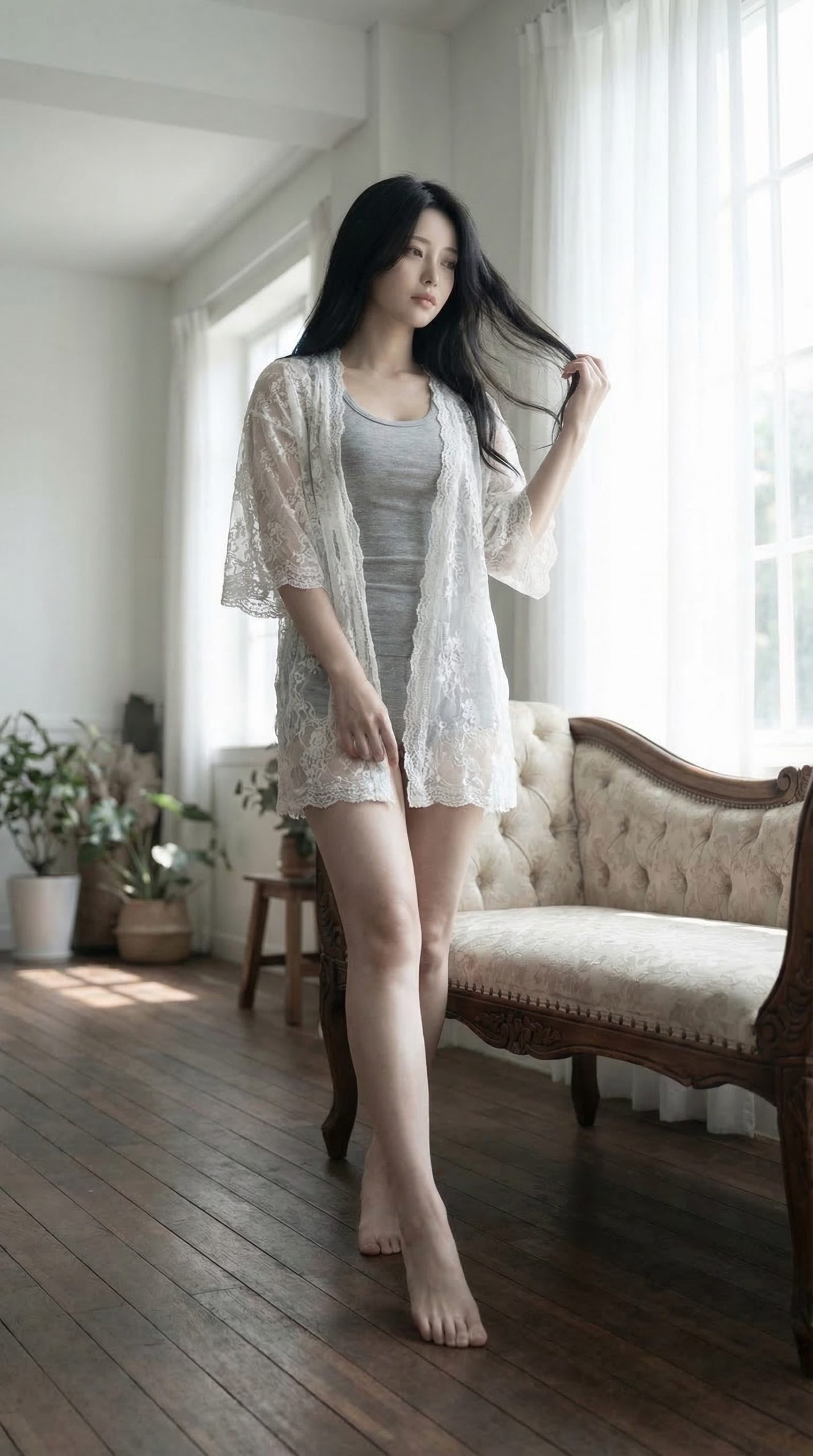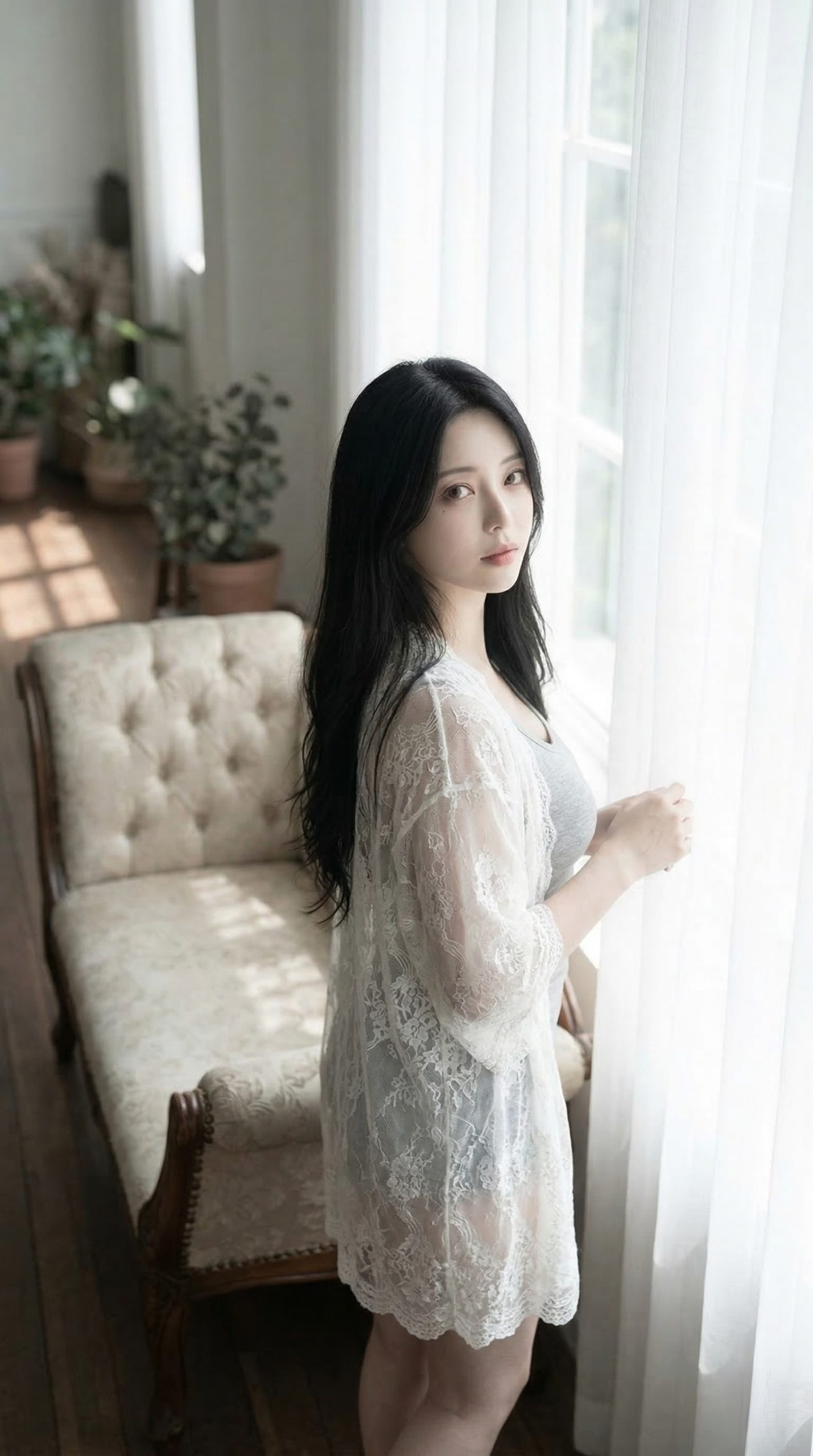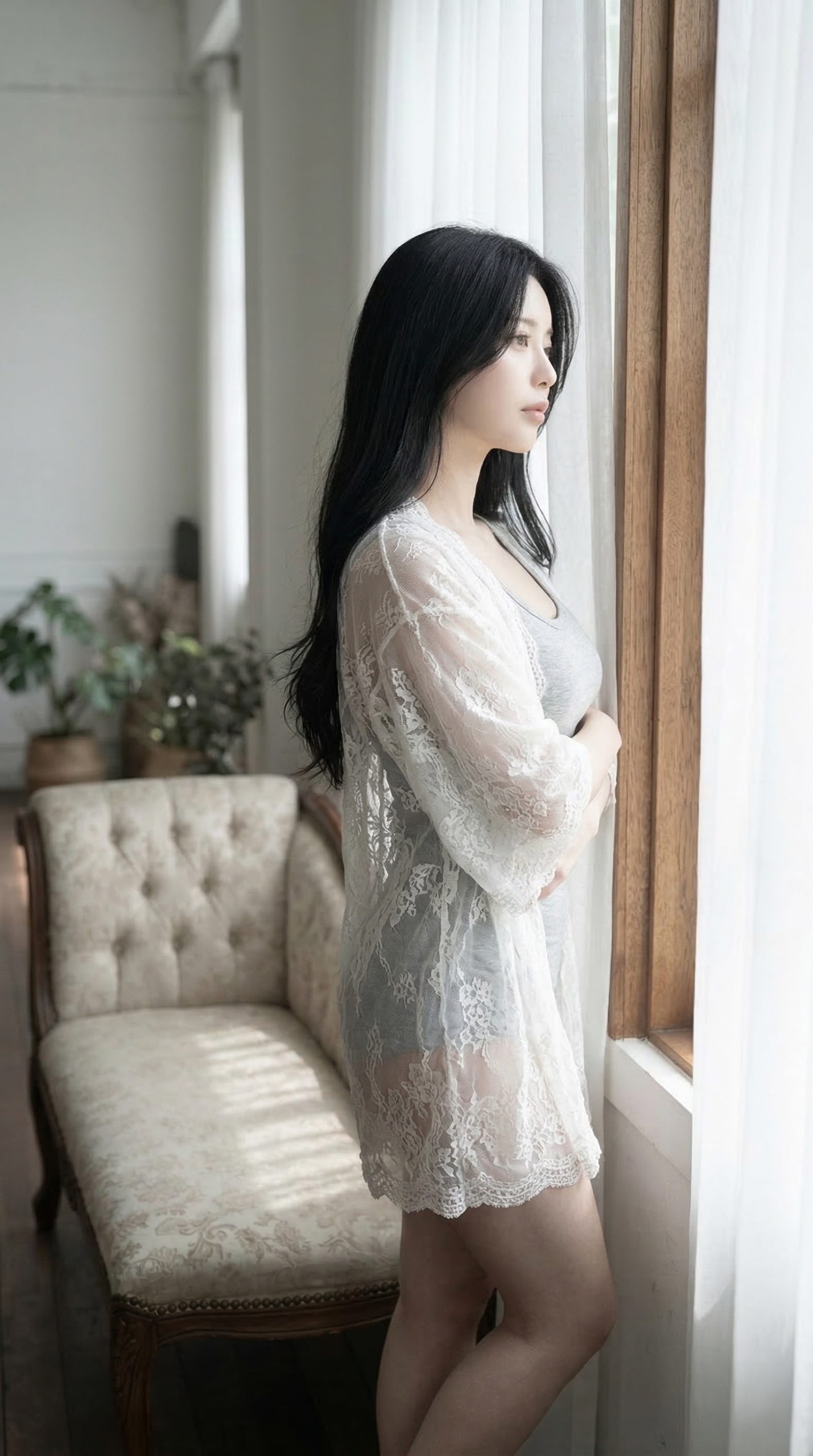 黒髪ロングという王道の清楚スタイルに、リラックス感のあるグレーのインナー。そして上から羽織った白いレースのガウンが、もう 反則級の色気 を放っていますよね。 レース越しにほんのり素肌が透けて見えるこの絶妙なバランス感、本当にわかってるな……と唸ってしまいます!