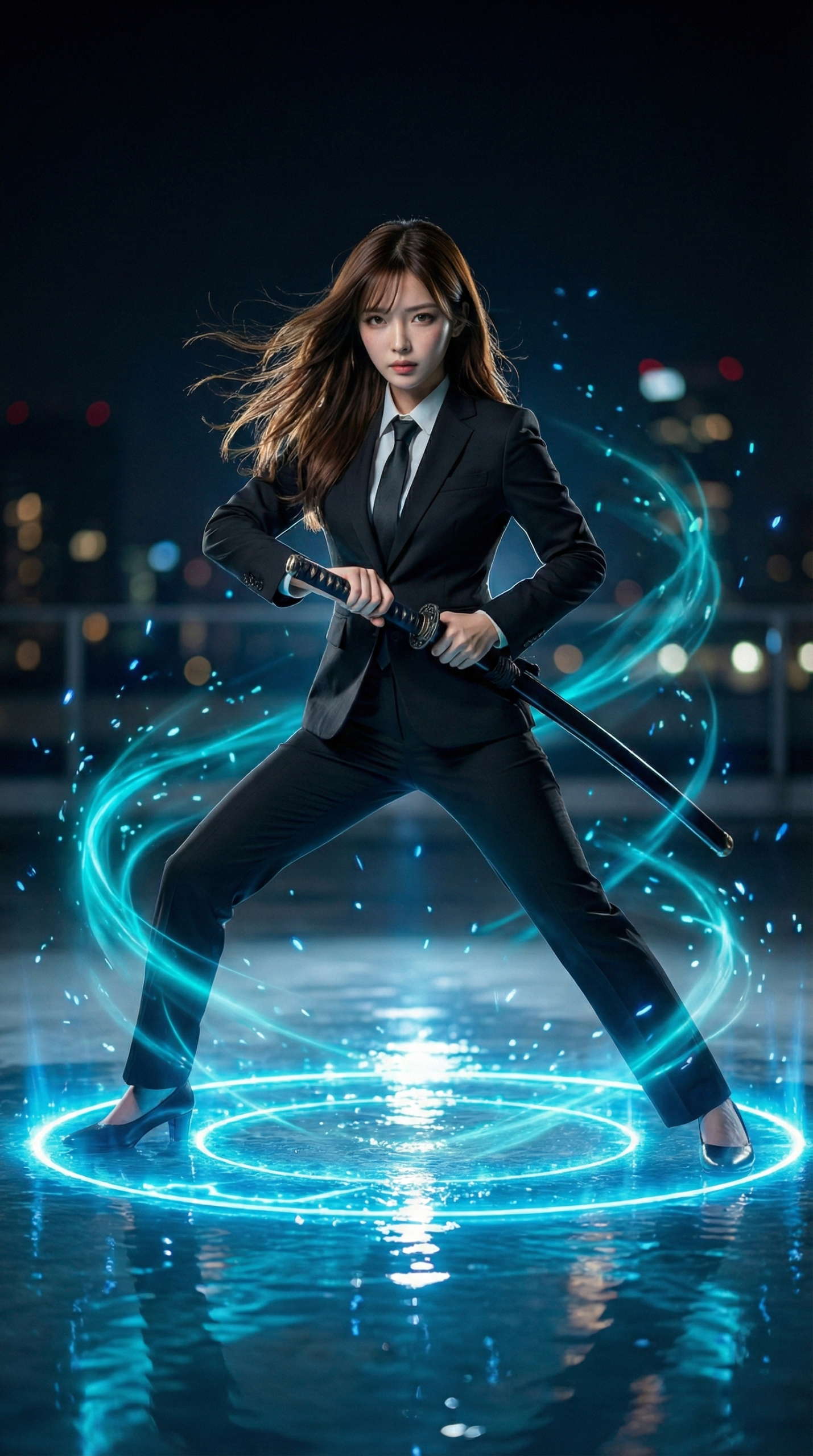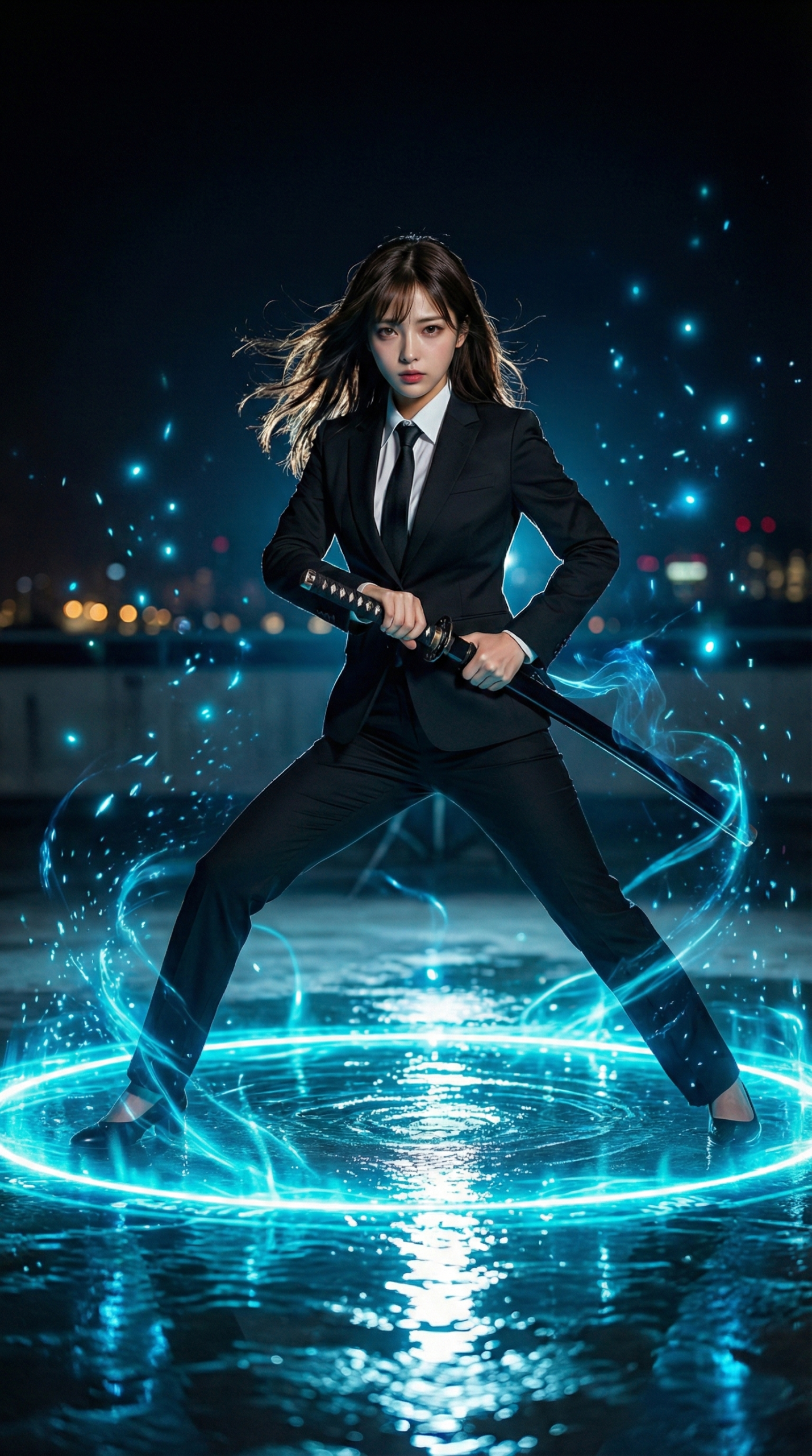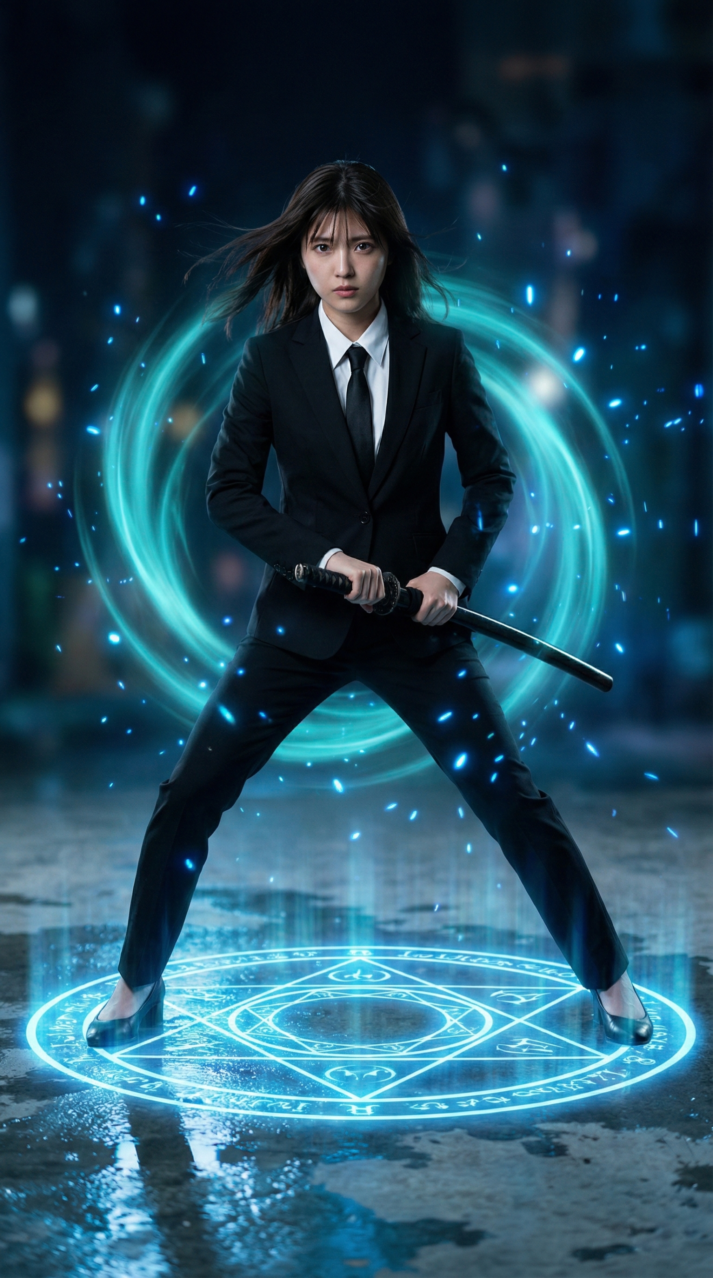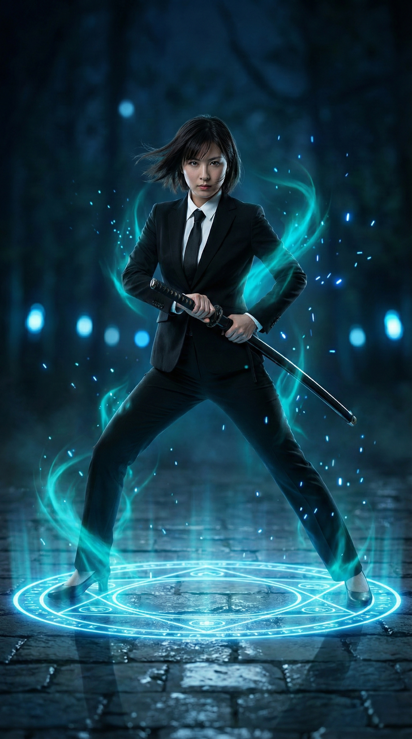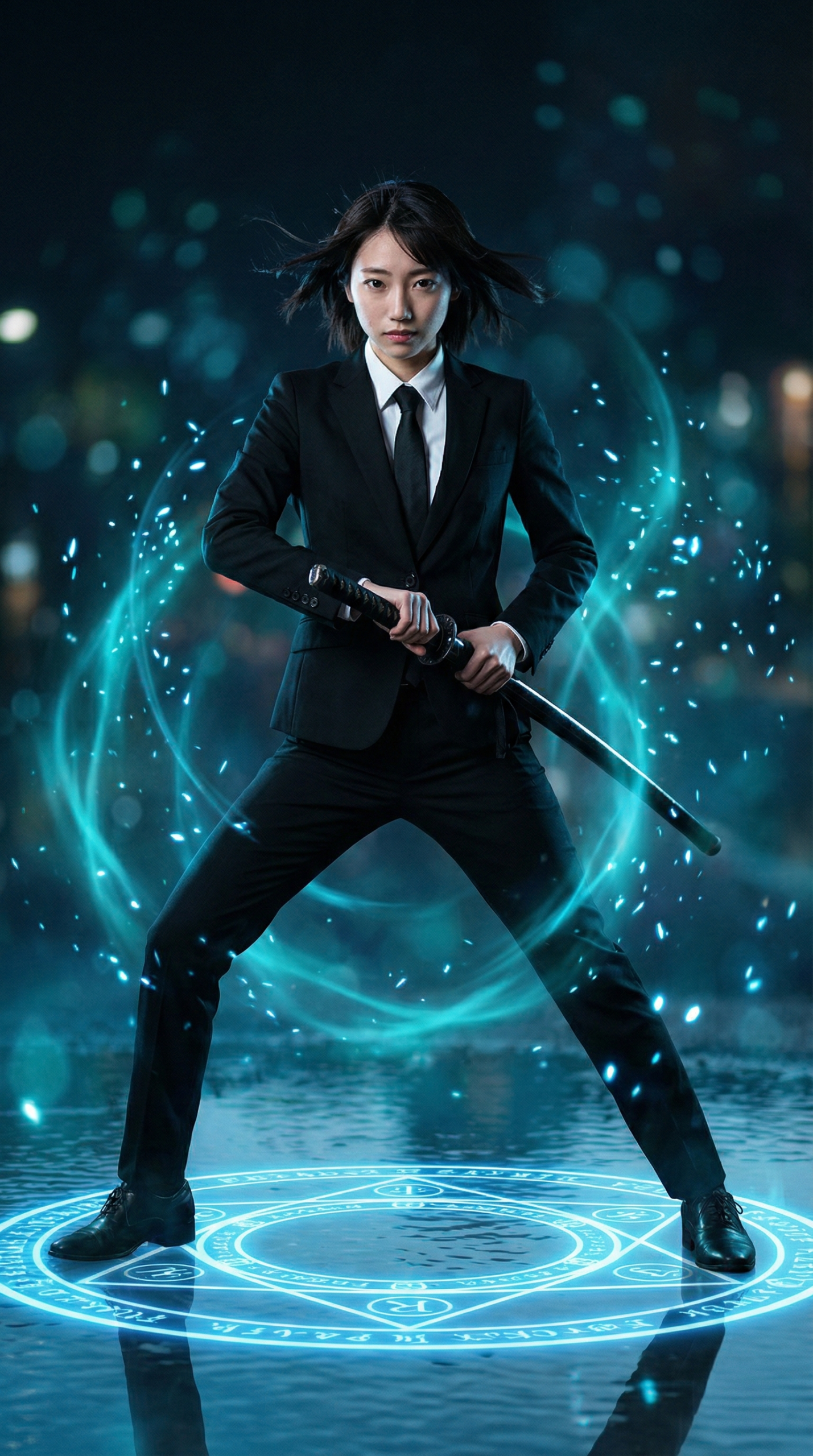 ただスーツで刀を持っているだけじゃないのが、この画像のニクイところ。 足元に浮かび上がる鮮やかなブルーの魔法陣や、身体を包み込むようなエフェクトが、まるで現代ファンタジー映画のワンシーンみたいで最高にかっこいいんです。