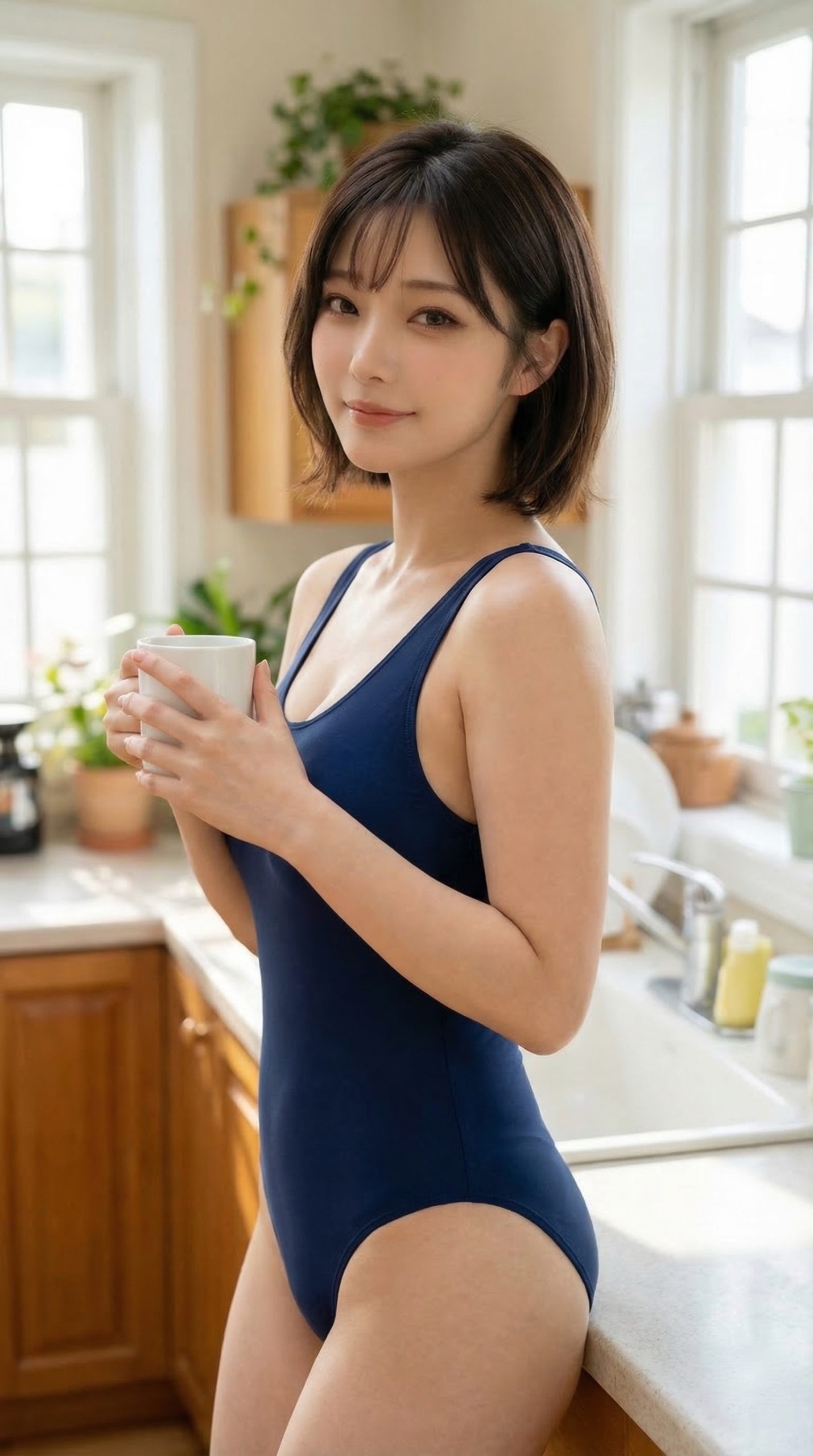 今回紹介するのは、まさにそのギャップがたまらない、最強のシチュエーションです。 明るい自然光が差し込むキッチンに、なぜか ネイビーのスク水 を着たショートボブの美女が現れたら……。