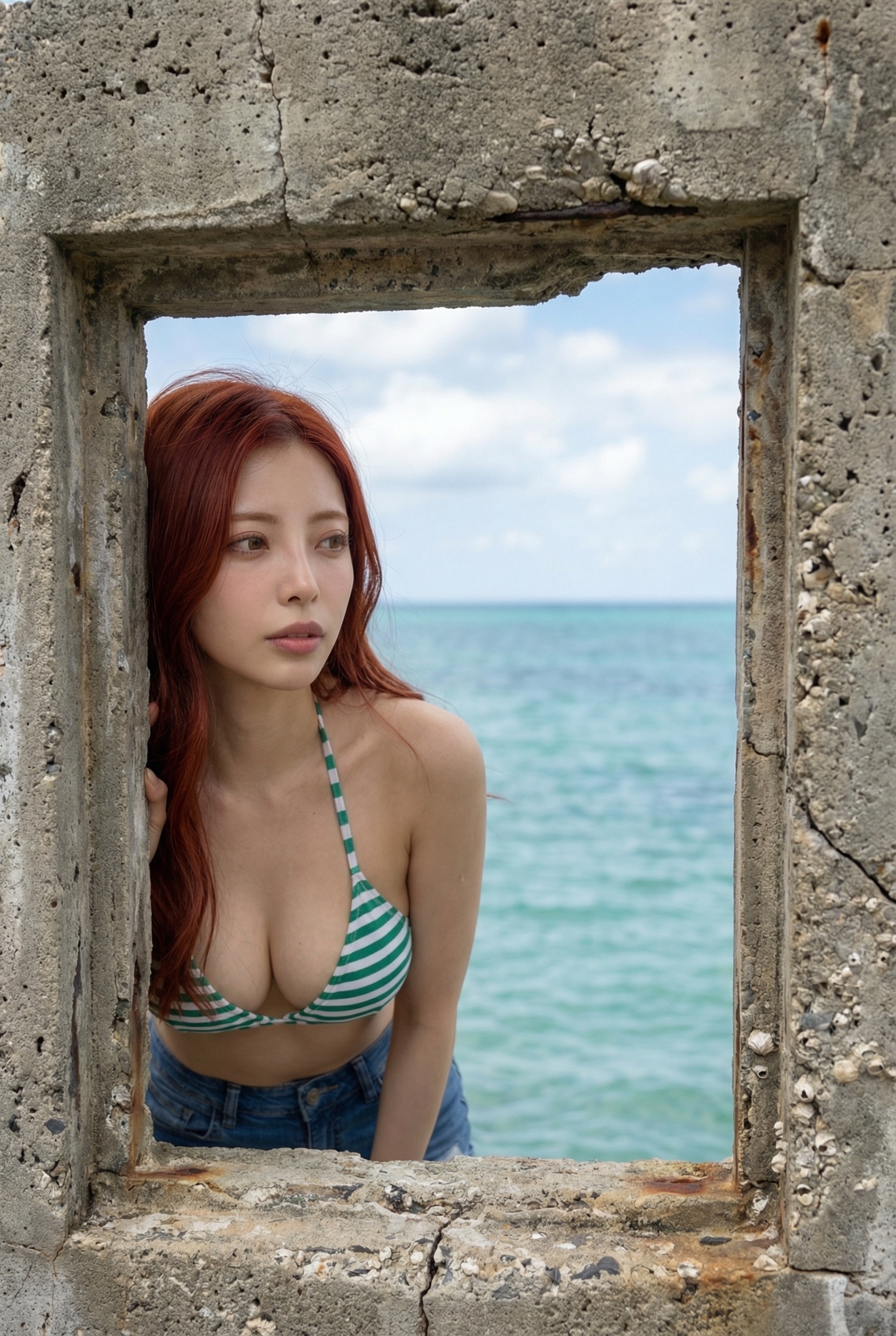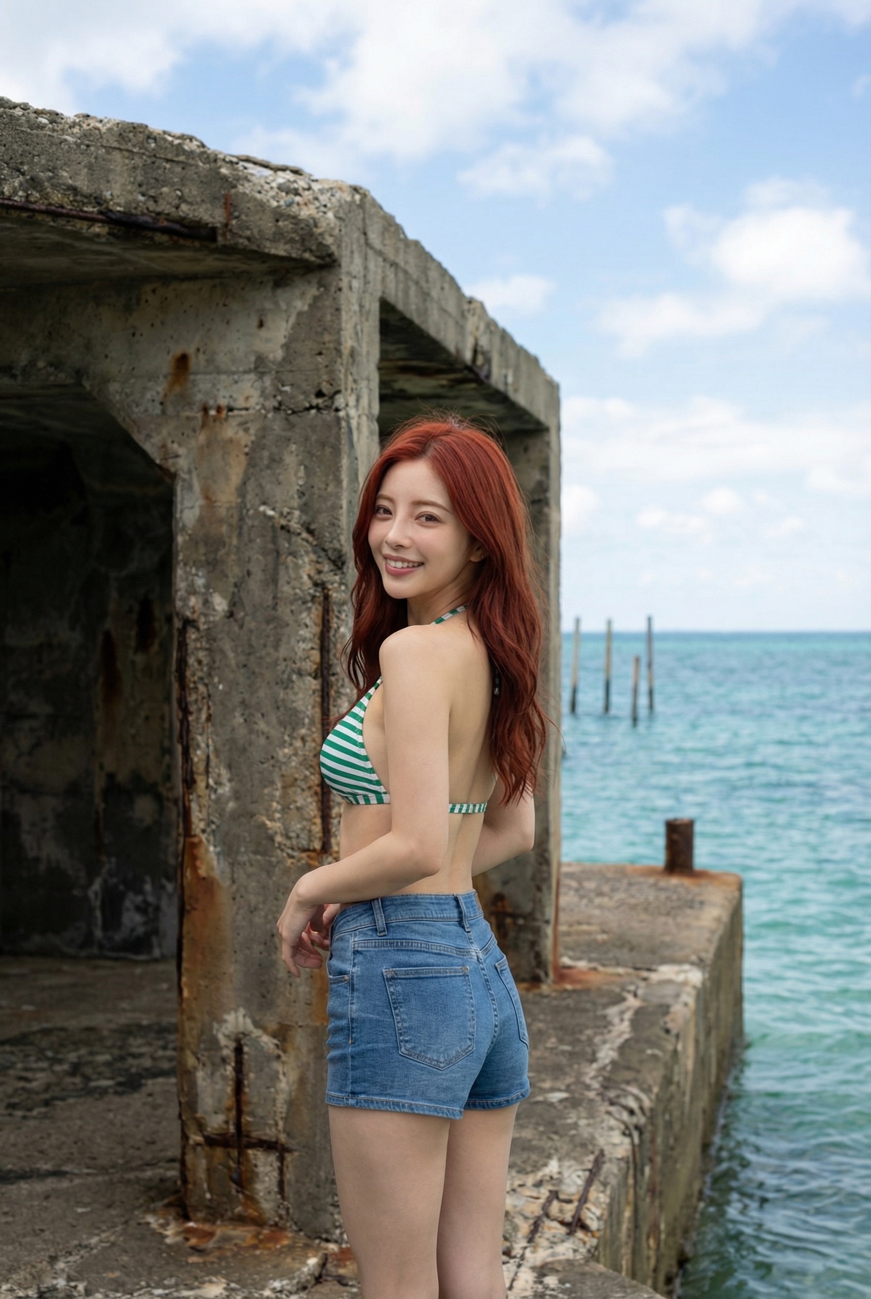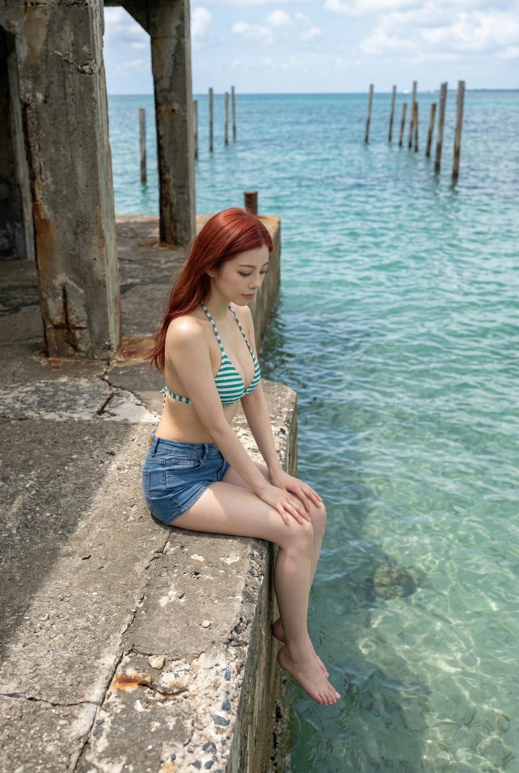 鮮やかな赤髪に、緑と白のボーダービキニがめちゃくちゃ映えてる! さらに、デニムのショートパンツっていうラフなスタイルが リアルな彼女感 を演出してて最高なんだよね 😍
