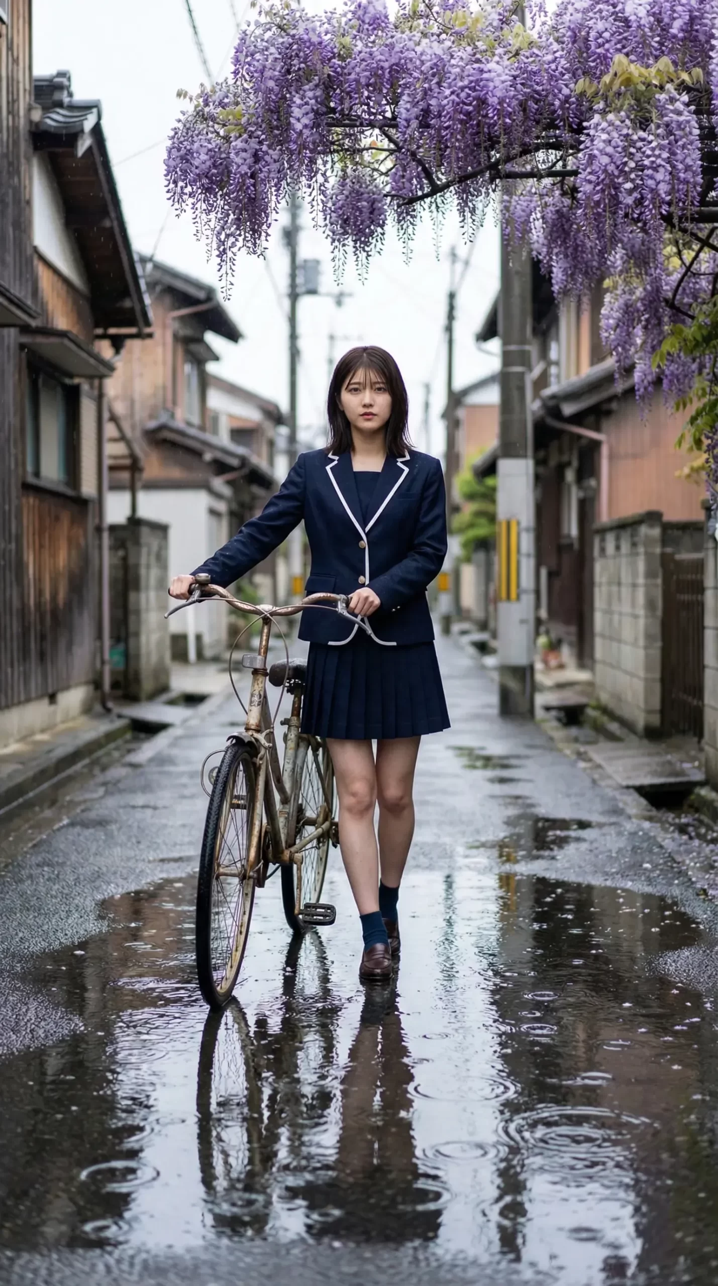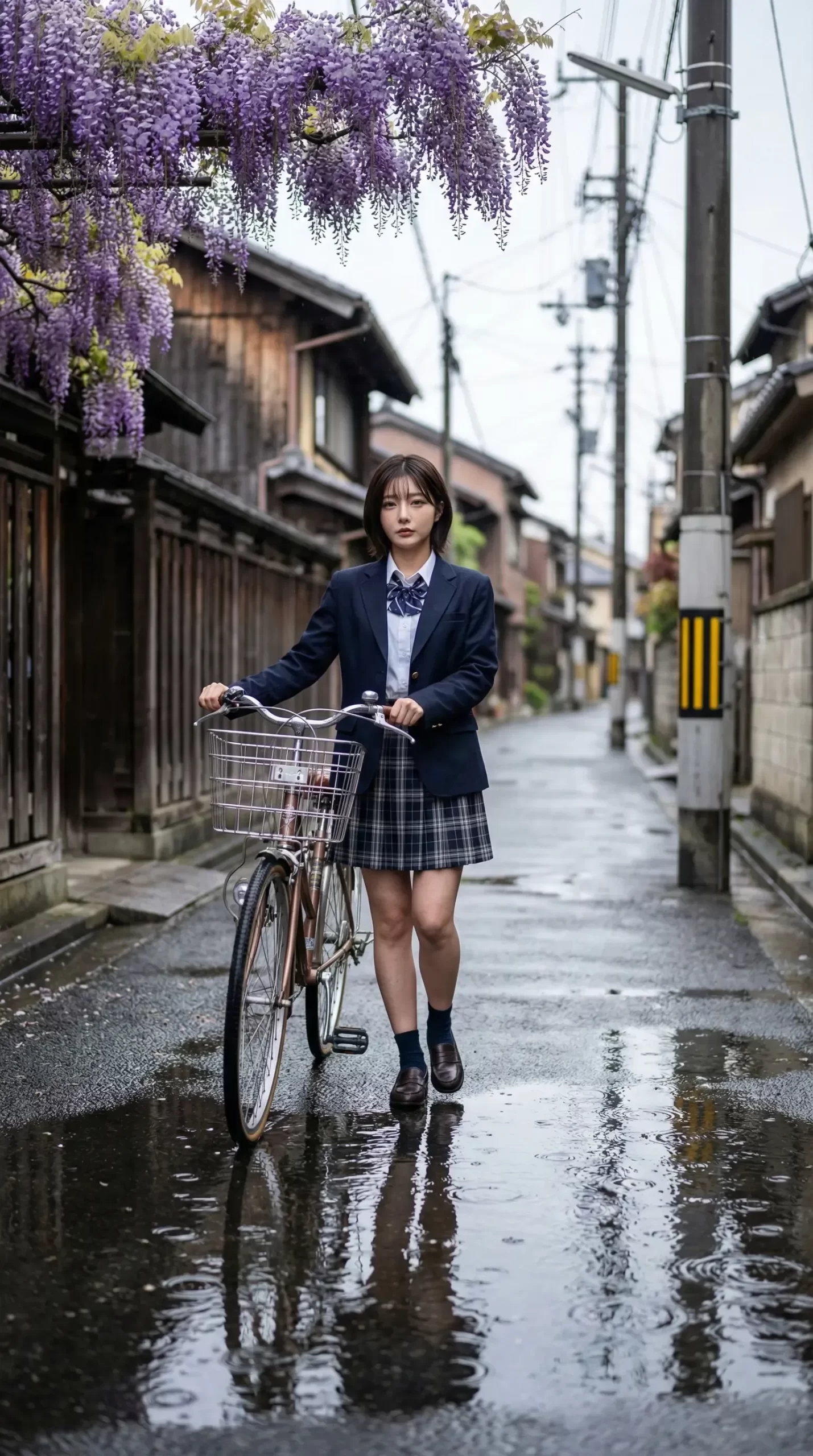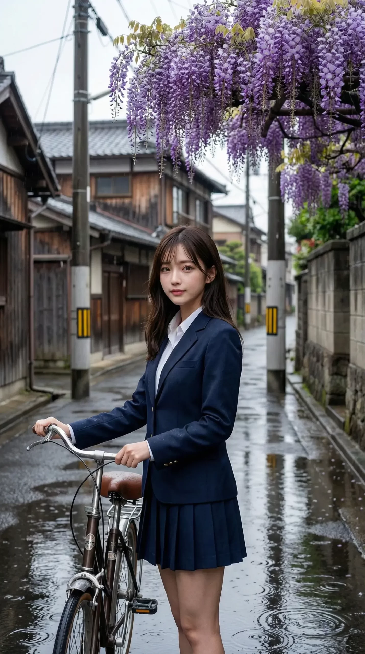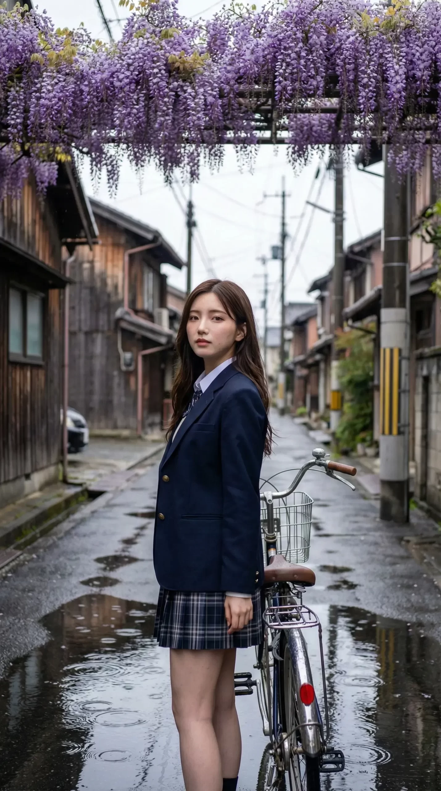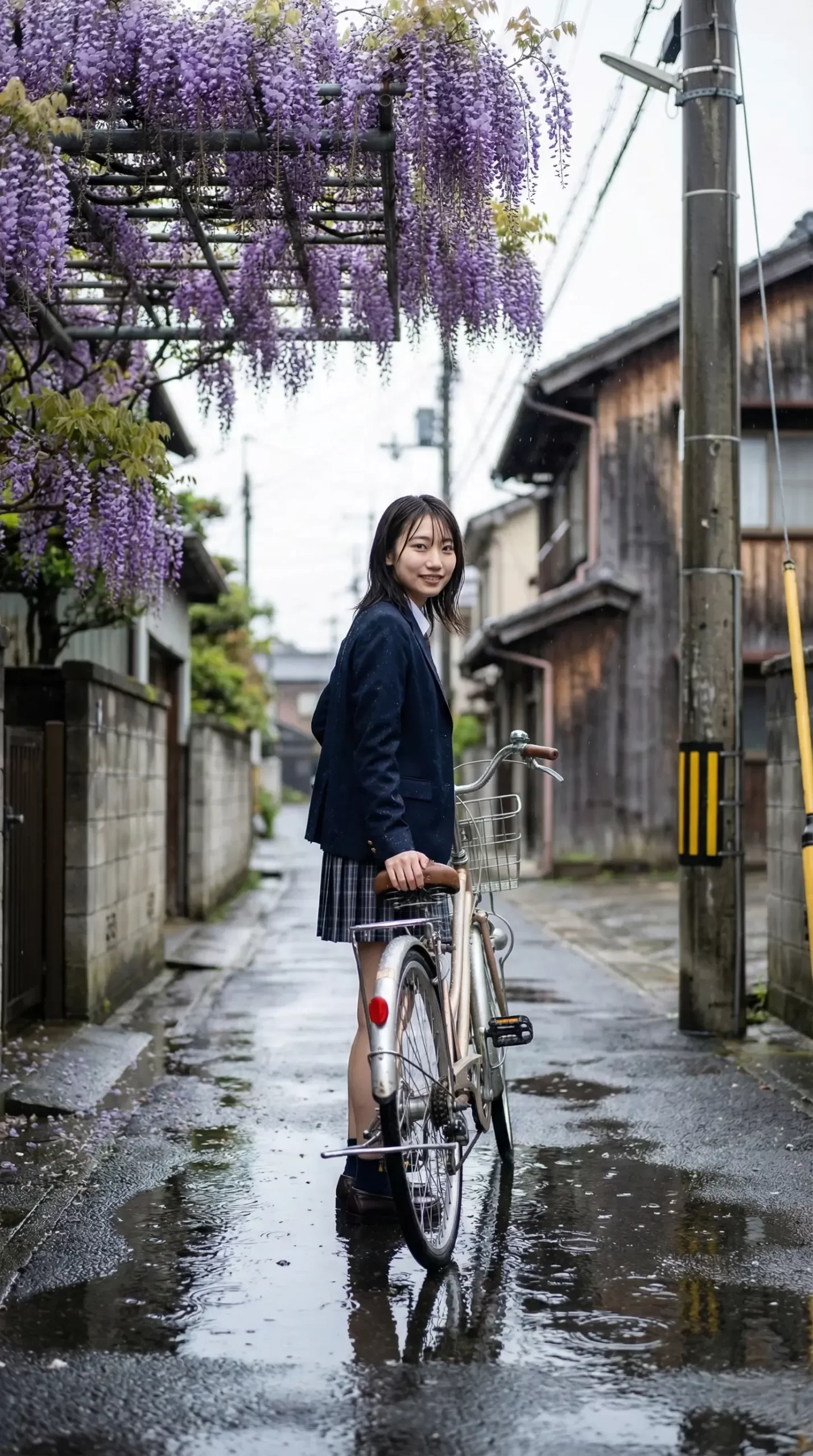 今回のテーマは、藤の花が咲くレトロな商店街と、しとしと降る雨。 そこで自転車を押して歩く制服姿の彼女たちです。