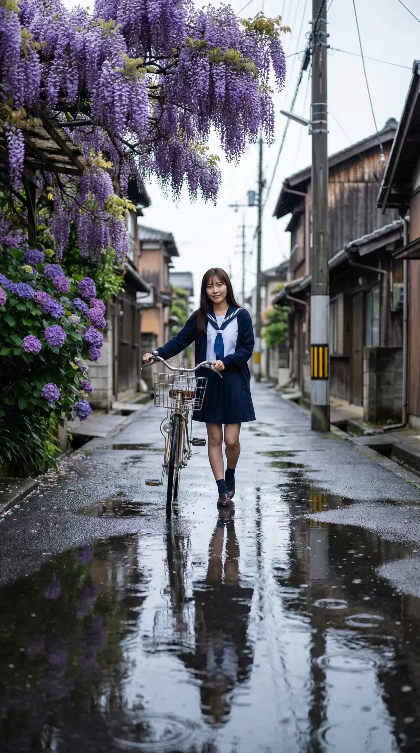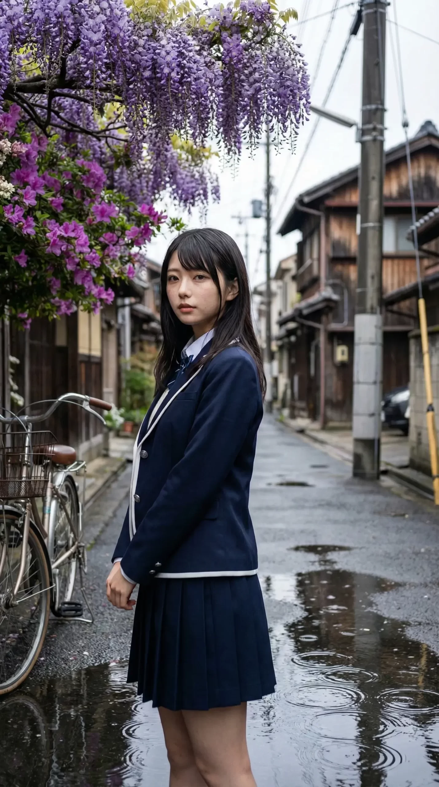雨に濡れたアスファルトや、水たまりに反射する街並み。そして、少し湿り気を帯びた空気の中に立つ制服姿の女の子。 傘をささずに、あるいは自転車があるからこそ、少し濡れながら歩くその姿には、言葉にできない色気と儚さが同居しています。