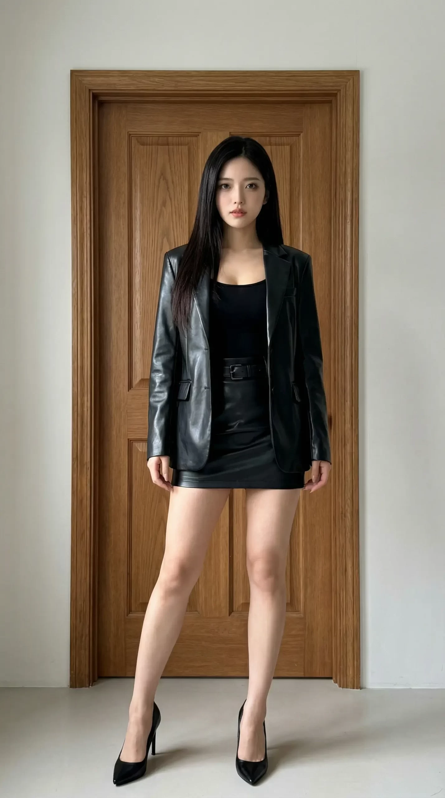 見てよ、この圧倒的なクールさと大人の色気…。 カチッとした黒のレザージャケットにピタッとしたミニスカート、そして足元は黒のピンヒール。この組み合わせ、控えめに言って最高じゃない?