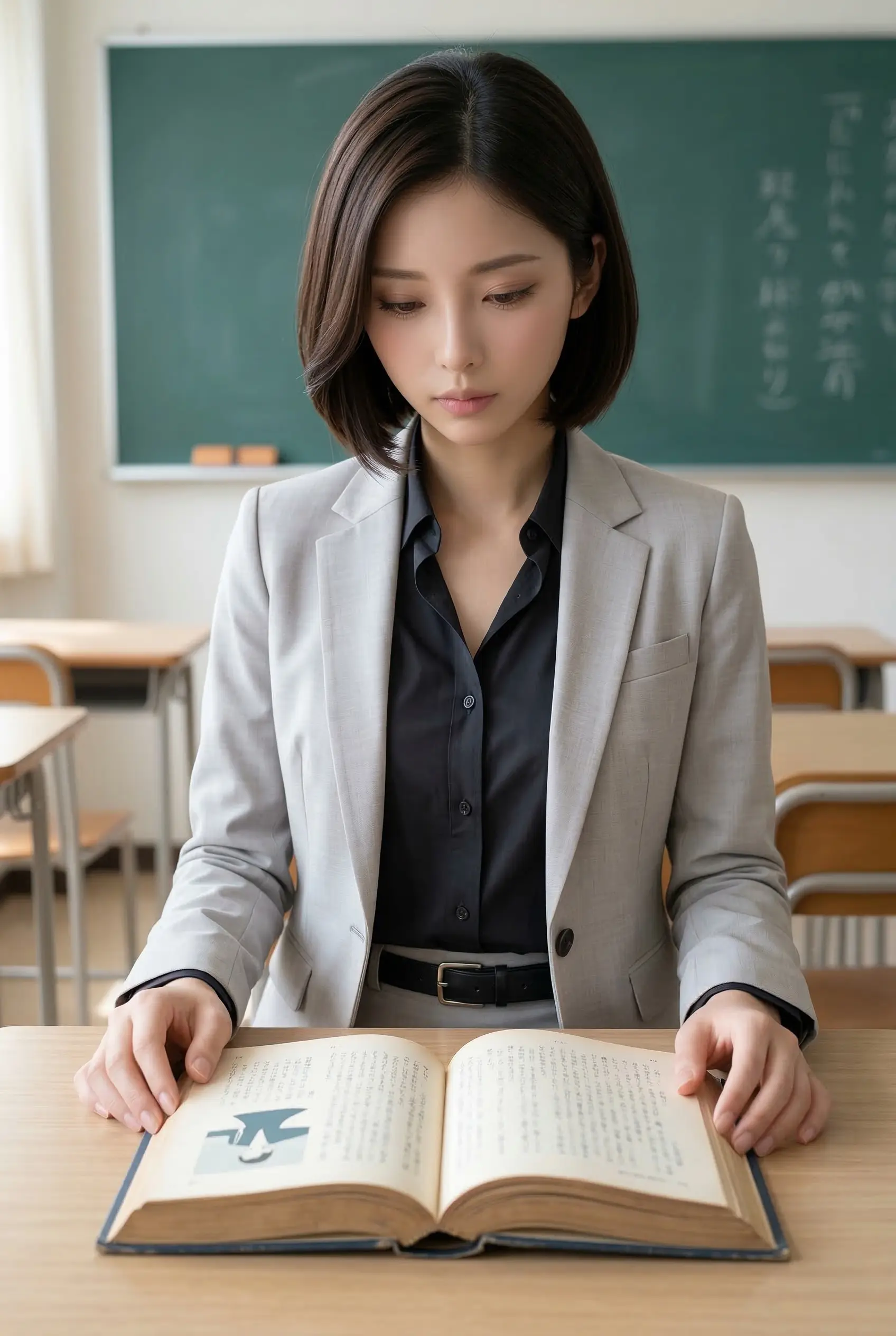この「学校という真面目な空間」と「大人のフェティシズム」の組み合わせは マジで破壊力抜群 じゃないですか? 😍 教卓に軽く腰掛けるポーズや、窓際で物憂げな視線を向ける仕草など、まるで「自分だけが知っている先生の秘密の姿」を見ているような背徳感にドキドキさせられます。